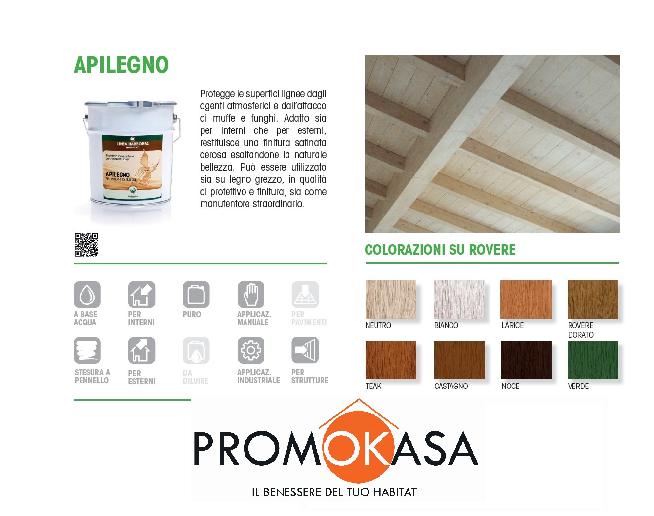 APILEGNO trova la sua vocazione ideale su tutti i manufatti in legno quali: tetti, case, infissi e strutture in legno di vario genere. Non adatto su superfici calpestabili. Oltre a proteggere il legno, grazie alla combinazione dei vari componenti inseriti nella formulazione, dona un risultato estetico caldo e morbido.